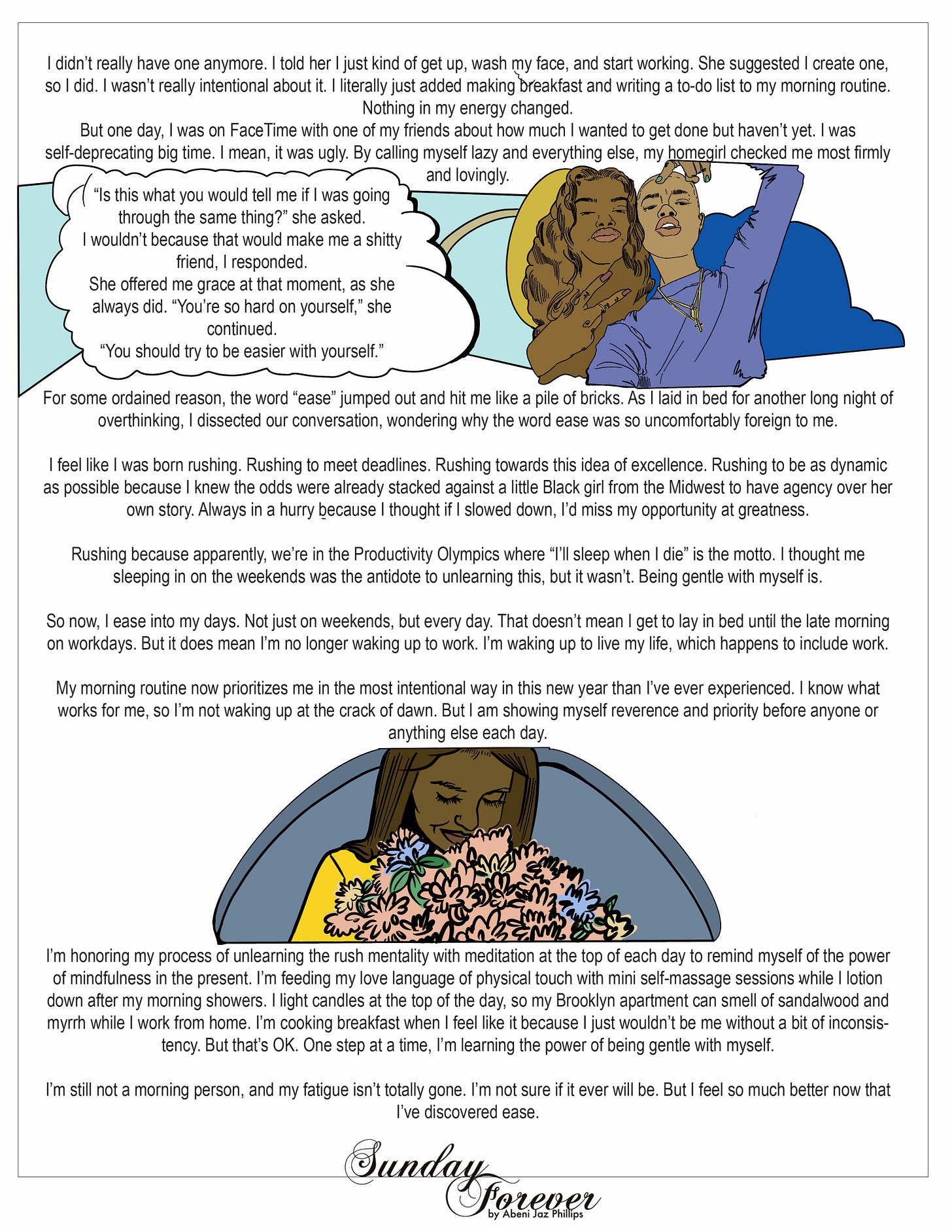 As I approach 33, I know I don’t need to rush. God has already prepared a place for me. Sunday through Sunday, I want to keep meeting myself where I am, and I encourage you to do the same by aligning with God’s plan for your life. As you’ll see in the self-care vision boards we’ve created at past Sunday Forever retreats, I invite you to create one that focuses specifically on your daily self-care routines. Map out each day of the week with intention for your mornings and evenings—and if you want to stretch, your afternoons too. This can live on the back of your vision board or exist on its own. The purpose isn’t productivity; it’s care. This will feel like producing. This will feel like laying the groundwork.